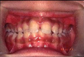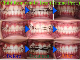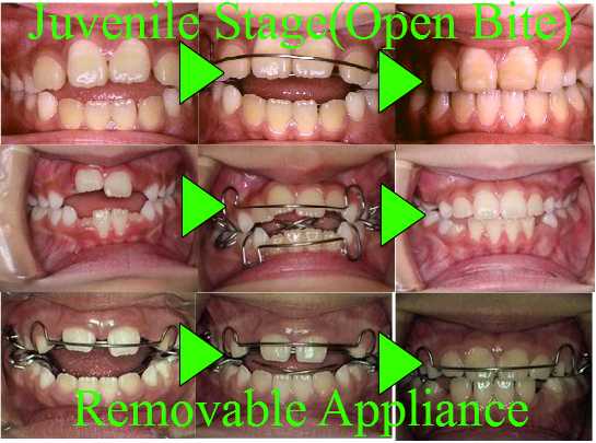 1級:一般的な治療手順は、叢生は歯列の側方径の問題で無く、前後径の問題であるので、ステージ1装置のカテナリーワイヤーで上下顎前歯のインディケーターラインが短くするので、オープンバイトになる。その装置の第1大臼歯部のレストに依って、大臼歯が圧下されて、第1大臼歯にオープンバイトになる。そして、上顎乳臼歯を抜歯して、バイトをクローズする。前歯に叢生がある場合は、上顎前歯部に、良好なガイドを与える事が出来ないので、カテナリーワイヤーで前歯を唇側傾斜させ、叢生は改善する。結果的に、叢生の改善はプラークの付着を減らし、外傷性咬合を無くし、顆頭の横ゆれを防ぐ事になる。